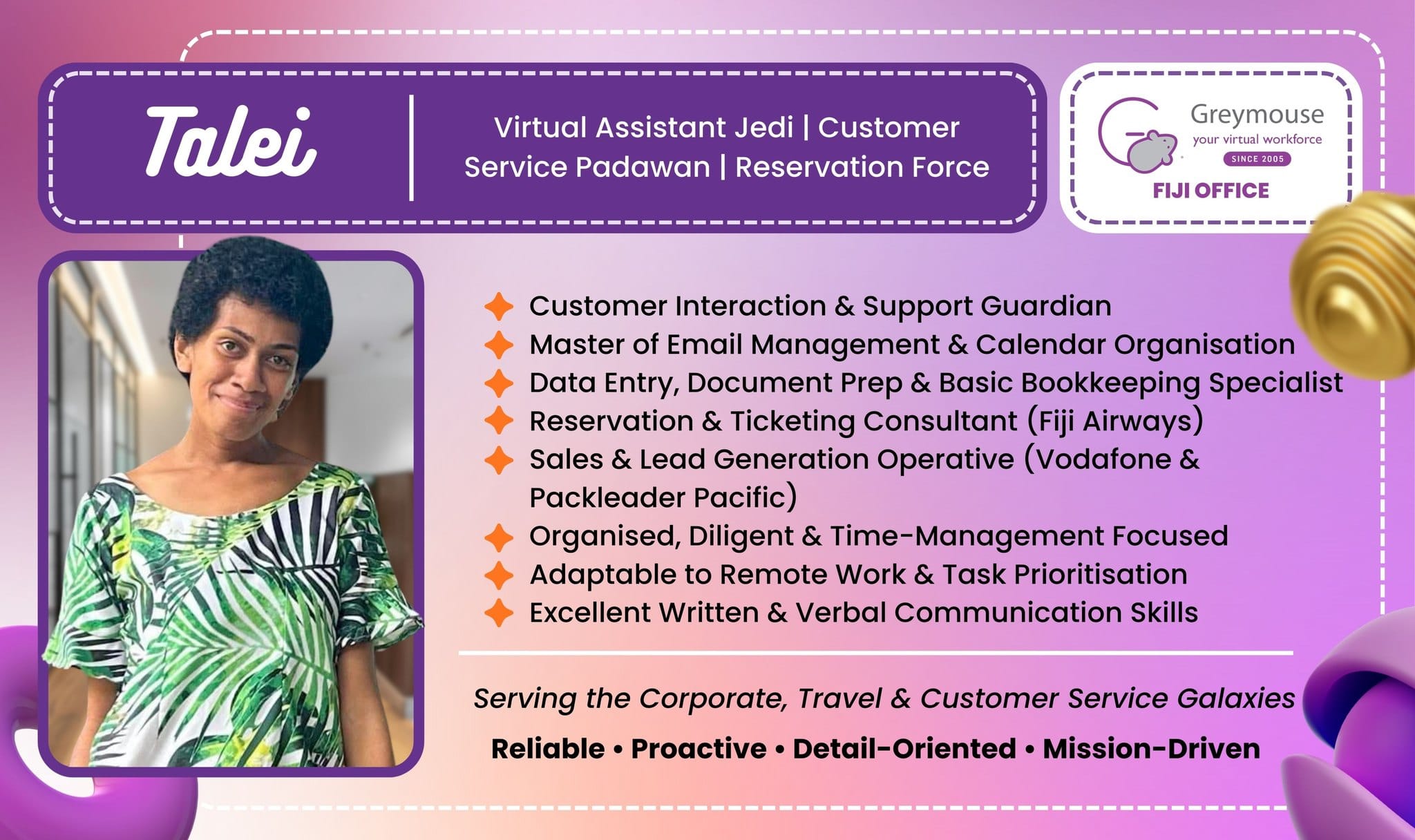 Businesses often have to multitask and may need some extra help in anything from everyday planning to booking and mailing. Instant Internet access allows you to hire a remote personal assistant who will perform working duties on a constant or shift basis. Greymouse will help you to select the right person with a required number of skills according to your needs, so you won’t waste your time surfing through hundreds of CVs. Your Virtual Assistant will have a phone line, chat or any other option of communication with you and will be ready to help exactly when it’s necessary.